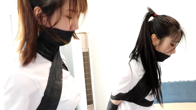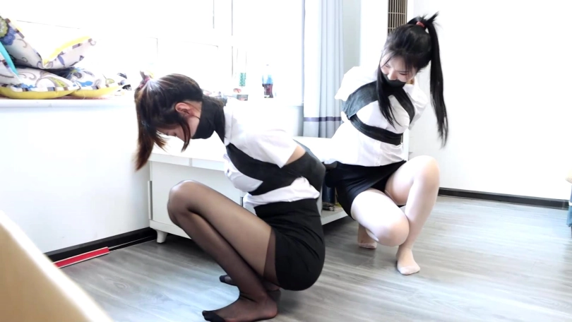 白丝美女醒来发现自己被绷带包裹囚禁,她急忙逃跑发现箱子里还有一个和自己也一样被捆绑的美丽白领,但是她黑丝丝袜,她们试着互相解缚但根本没法脱缚,突然男人出现,她们赶紧如同小鸟一样躲避着男人,但男人有个奇怪的app好像能控制她们腿上的丝袜,这时候她们的丝袜突然被男人控制,紧紧并拢在一起分不开了,而此时2个丝袜美人彻底变成了男人肆意遥控的玩物。