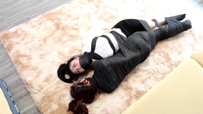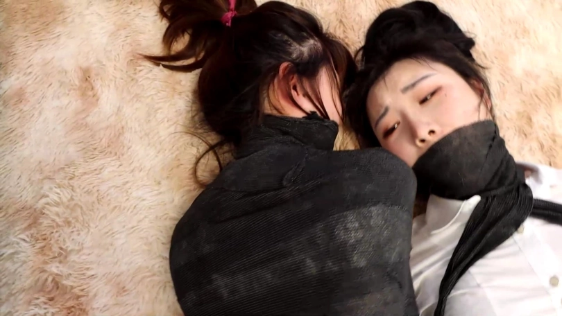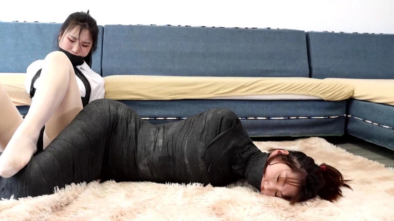 白丝美女终于在同伴的帮助下解开了丝袜美腿的拘束,但同伴却被完全包裹变成了可怜的木乃伊美女,白丝美女努力的去帮助同伴,但没想到木乃伊包裹自己带防御功能,将白丝美女也捆绑在一起了,2个可怜的美女不停的蠕动挣扎无法挣脱。