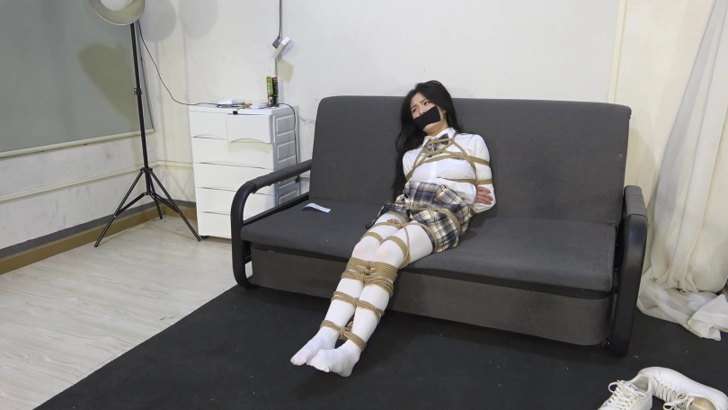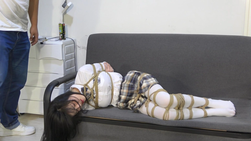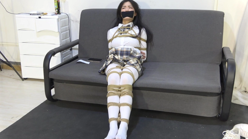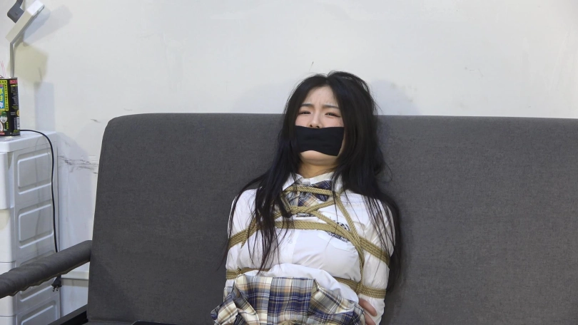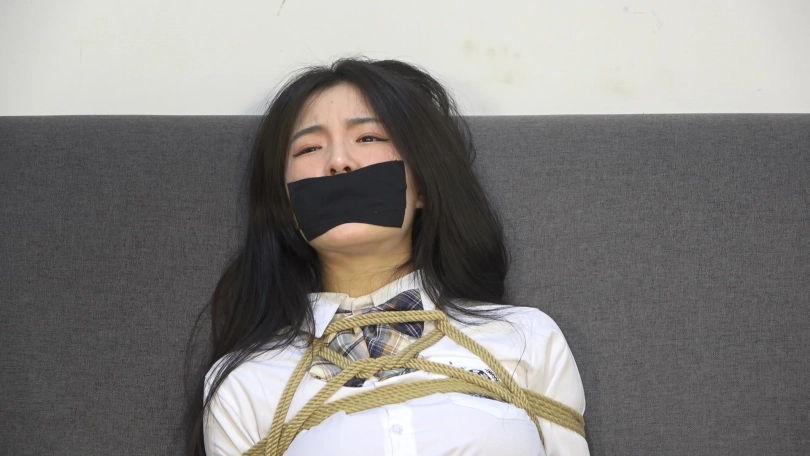 嘴巴用丝袜堵嘴,然后在外面用黑色胶带封住嘴巴。