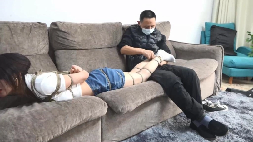 (途中珊珊一直大喊大叫,对着小明进行侮辱,小明于是将丝袜塞进了珊珊的嘴里,并用胶带固定。)