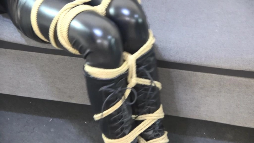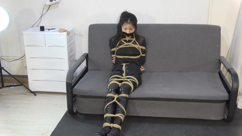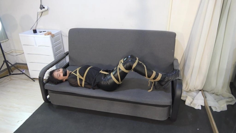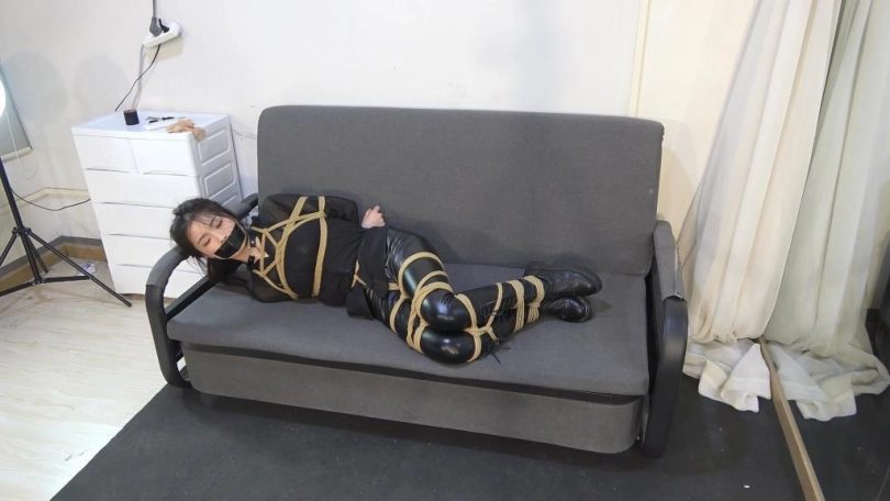 小狐狸服装为黑色皮裤、黑色长靴、黑色衬衫一身黑