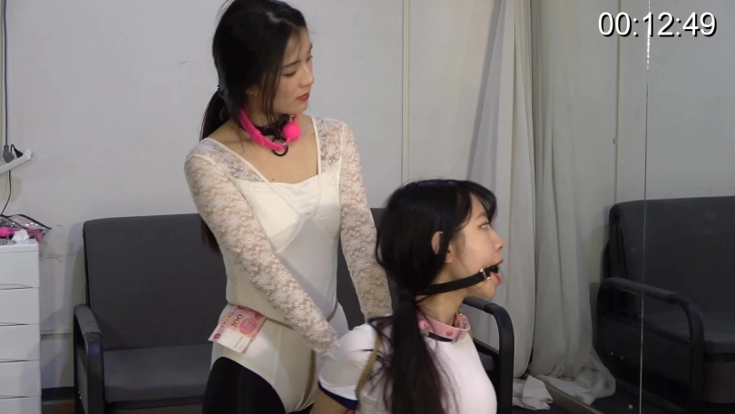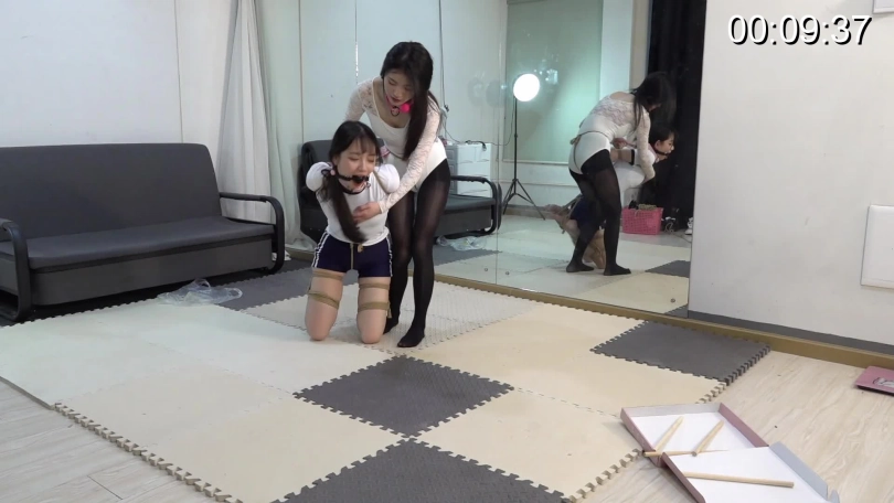 Part1:两人上身被直臂捆绑,腿被折叠捆绑。两人同时出发,看谁能先将盒子里的棒子用嘴叼回,先叼回3根的获胜并获得100元奖励。失败的接受惩罚,需要被获胜者牵着用膝盖行走,之后再被直臂吊起来。