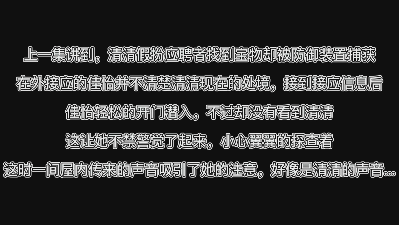 上一集讲到,清清假扮应聘者找到宝物却被防御装置捕获