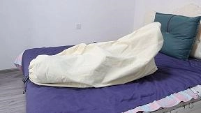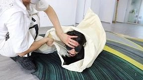 MM穿上性感的裙子打扮得漂漂亮亮的等着老公回来想给他一个惊喜,因为今天是老公的生日。门铃响了,MM迫不及待的走去开门,哪知映入眼帘的是一个带着面具的男人。MM正想惊叫,蒙面人早已把沾有迷药的毛巾捂了过去并推了进去把门关上。MM挣扎了一下昏迷了过去。蒙面人把MM拖到沙发上,把MM捆了个驷马,嘴里塞上丝袜带上塞口球,并带上眼罩。蒙面人拿出一个大号白色布袋把MM从头到脚装了进去,扎紧袋口,扛进卧室丢在床上,自己出去了。MM醒了过来,发现眼前黑漆漆的,想叫却发现嘴被堵住了,想挣扎但手脚被捆住了。MM有点害怕,呜呜叫着蠕动着(挣扎要激烈一点,呜呜叫要动听迷人点),挣扎个10来分钟。这时蒙面人进来了,他看着床上蠕动着的人形袋子很是兴奋,忍不住上去摸她。MM挣扎叫得更厉害了。蒙面人觉得还不够过瘾,拿来一个麻袋,把白布袋从脚到头套进去,扎紧麻袋口放到地上。麻袋鼓鼓的,不停挣扎着,蒙面男心里兴奋,忍不住笑了出来。MM听声音,认出了是老公,呜呜叫着示意老公把自己放出来。但蒙面人似乎不太理会,还拍打MM屁股。MM急了哭了,蒙面人这才于心不忍,解开麻袋把MM放了出来。蒙面人解开MM的堵嘴之物,MM正想发飙,蒙面人深情地抱着MM吻了下去。结尾文字编辑,原来这是MM老公的恶作剧,他看到电视剧美女被捆绑装进麻袋就很兴奋,一直想着什么时候自己也能绑老婆装进麻袋,这次过生日终于如愿了。
