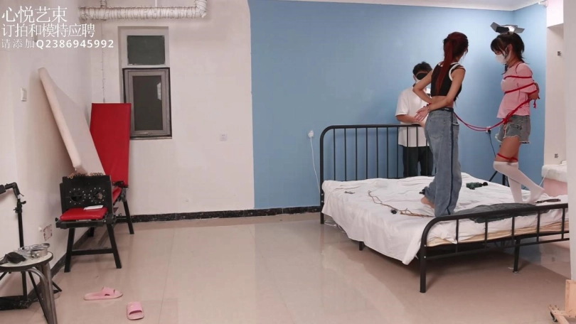 本来想要把两个妹子一起连腰绑起来一起吊着得,结果脚绑住了站不住,后面就用了双重驷马,脚联动起来TK。最后有把两个人用绳子连起来玩躲猫猫游戏,抖S戴着眼罩抓两个绑起来戴着镣铐得小美人。