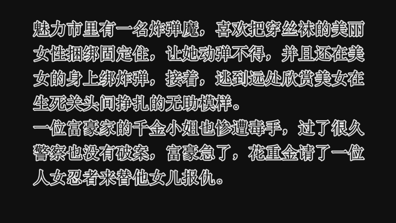 【视频时长】:00:39:53 【文件大小】:1778MB 魅力市里有一名炸弹魔,喜欢把穿丝袜的美丽女性捆绑固定在椅子上,还在美女的身上绑炸弹,接着,逃到远 处欣赏美女在生死关头间挣扎的无助模样。 一位富豪家的千金小姐也惨遭毒手,过了很久警察也没有破案,富豪急了,花重金请了一位人女忍者来替他女 儿报仇。 这天,女忍者和富豪商谈完毕,回到了宾馆。 女忍者检查一下自己的装备,准备出发 谁知炸弹魔忽然出现,打昏了女忍者。 炸弹狂魔对女忍者各种拷问,让她说出谁雇佣了她。 女忍者是很有职业道德的人,死也不说,就是摇头。 炸弹魔就说,那你就去死吧。 炸弹魔把女忍者四马攒蹄绑起来,然后蒙住眼睛,堵住嘴,炸弹也绑身上,然后就走了。 炸弹一边倒计时,女忍者一边挣扎,终于在倒计时快结束的时候,挣脱的绳索,停止了炸弹。 然后在被蒙眼堵嘴的情况下,摸索着开门逃走了。 (待续) 首选下载:神木林视频库【支持直接在线观看,在视频下方直接按清晰度下载,画质和百度云下载一样,永不失效,非常推荐】 备选下载:百度云链接,容易失效,画质也和神木林视频库相同,只作为备份使用,并不推荐,解压码:0125 ![]() ![]() ![]() ![]() ![]() ![]() ![]() ![]() ![]() ![]() ![]() ![]() ![]() ![]() ![]() ![]() ![]() ![]() ![]() ![]() ![]() ![]() ![]() ![]() ![]() ![]() ![]() ![]() ![]() ![]()