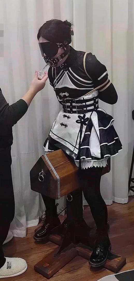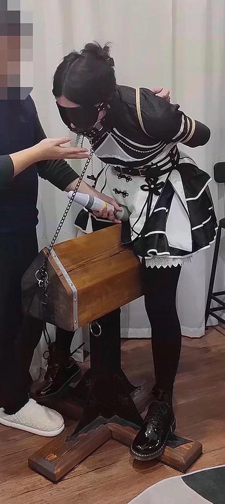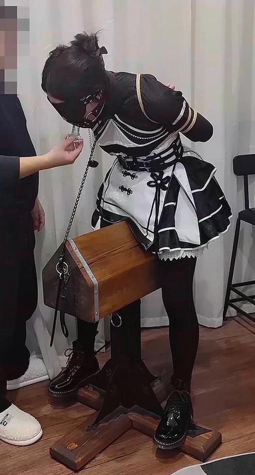 第二段是木马骑坐,双脚脚踝用扎带固定在木马底座上了(因为鞋子是黑的大概看不太清),后面还把项圈锁在木马上。玩法是开口器硅胶棒深喉,以及边深喉边震动。