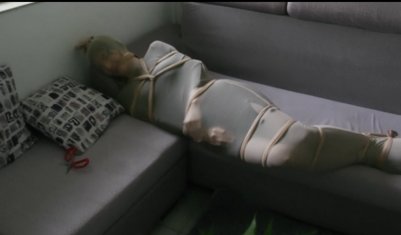 海星下班回到家中,不知道哪里掉下一条丝袜,然后她被丝袜包裹住,怎么都挣脱不开,并被绑了手脚勒了嘴巴,最后又从天而降一把剪刀,废了九牛二虎之力解开后,海星气喘吁吁瘫在沙发上,这时候又掉下来一条丝袜,海星不禁喊了一句:“还来?”