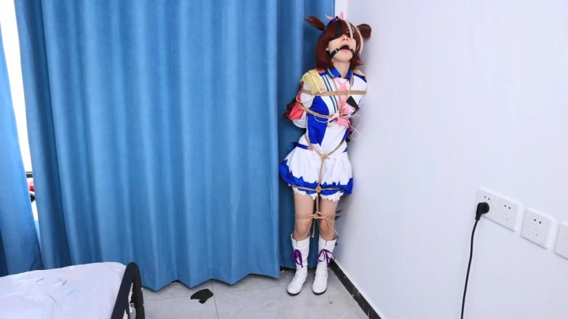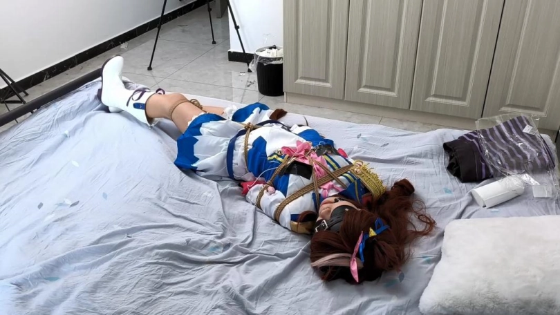 小母马刚刚进门就被挟持晕了过去,等待她的就是绳索的紧缚,但是劫匪似乎有意的疏忽,给她留下了双脚没有束缚。醒来后的小母马万分挣扎总算离开了床上,只可惜刚刚沿着墙边摸索到门口,就被进门的歹徒重新挟持。