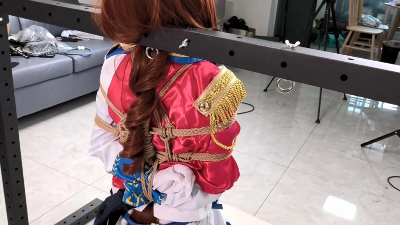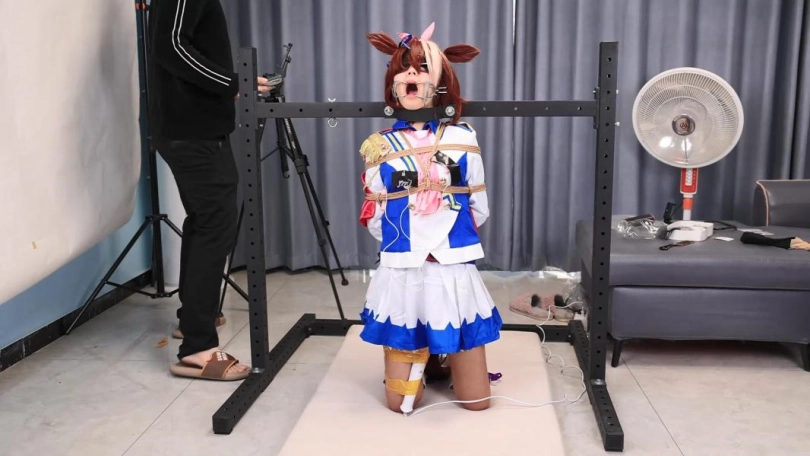 恼羞成怒的歹徒将小母马的脖子锁在了一个铁架上面,让小母马只能跪在地上。再用口环撑起小母马的嘴巴,玩弄她的舌头。下面用上不可描述,开上最高的挡位让小母马体验最高的狂欢