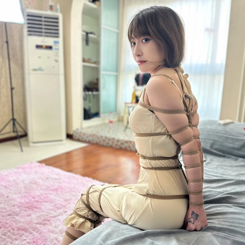 第二段 香槟色丝绸连衣裙这套显得小艺性感中透漏点成熟 绑法为欧式直臂蛇缚 肉丝勒嘴