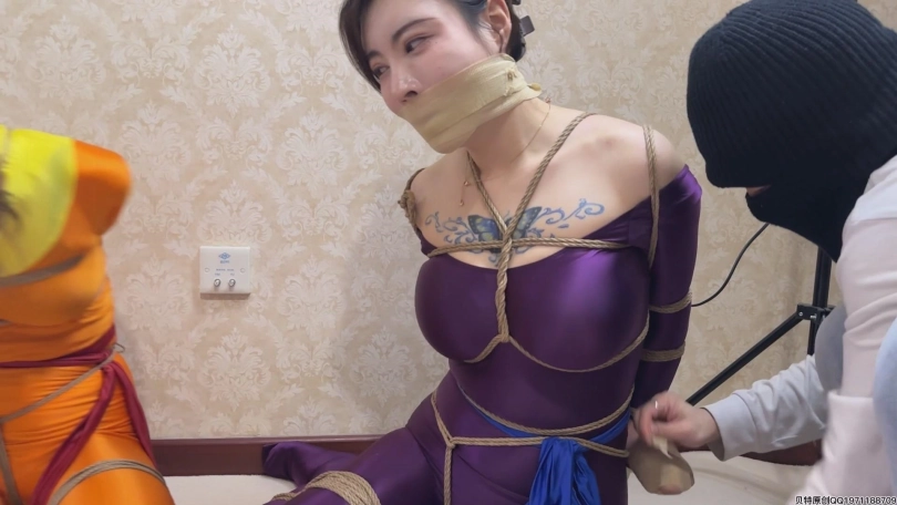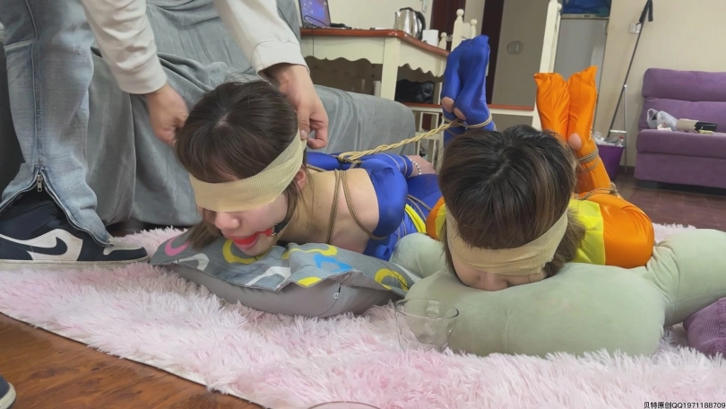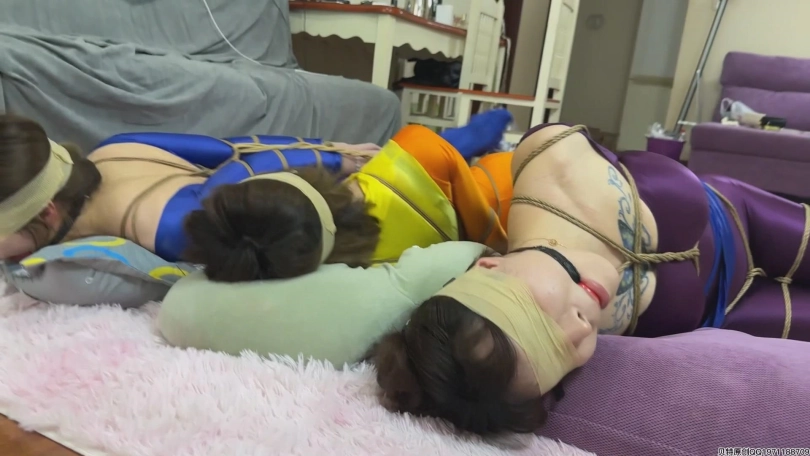 下部为三姐妹潜入盗画,中了陷阱被迷晕绑了起来,后来又被绑成驷马,带着口球不住的流口水,最后被装袋运走关押了起来。歹徒为了防止三人逃跑,将三女的手和嘴都用绷带缠了起来,等待三女的命运将是什么?