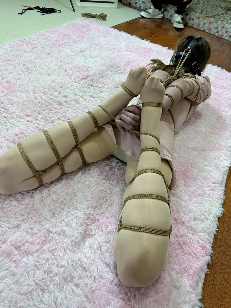 第二段:后手观音并退缚 戴眼罩的马具口塞安排上 同样连头驷马强制抬头放置挣扎 中途贝特挠了挠琪琪的小脚丫 绑完后琪琪表示每次绑完观音手都像是要断了