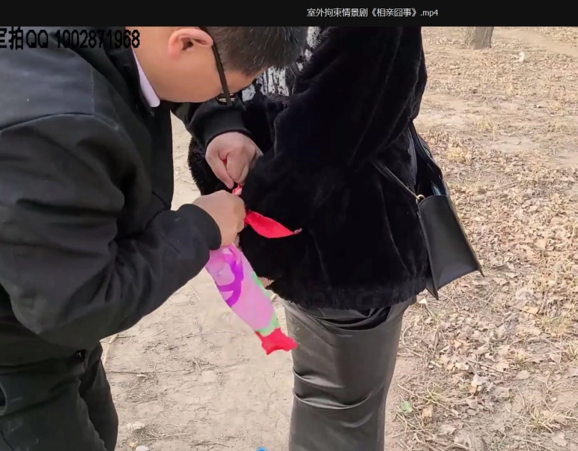 说着男人拿出一条围巾(丝巾也可以),把女人双手反绑起来。