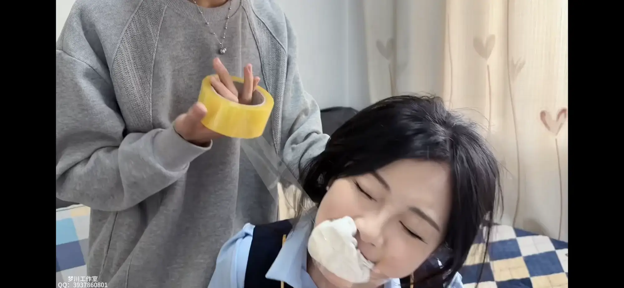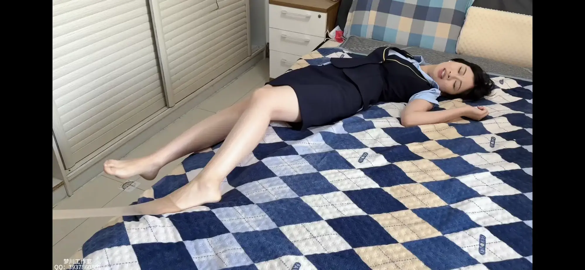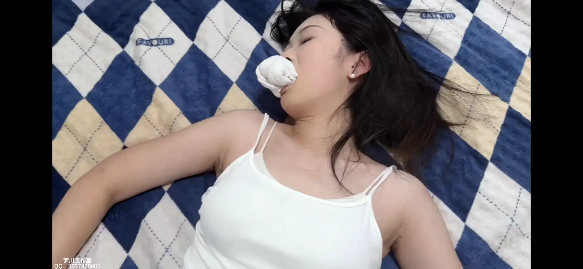 她腿上脱下的丝袜反绑她的手腕,并捆绑住她的脚踝,又用白毛巾堵住她的嘴,