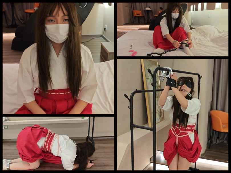 苏苏身着巫女装扮,先给自己戴上了手铐脚镣,之后塞好td,不一会儿便有了感觉,在床上挣扎蠕动,之后给自己绑好了龟甲缚,戴好眼罩,进行一段距离的跪爬惩罚,td露在地上跟着被拖动十分涩涩,接着塞上口球吊在架子上td开到最大并抚摸tk,打屁屁,不一会儿苏苏就腿软了,最后将手帮到后面m腿放置,最终达到了小高潮