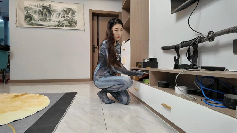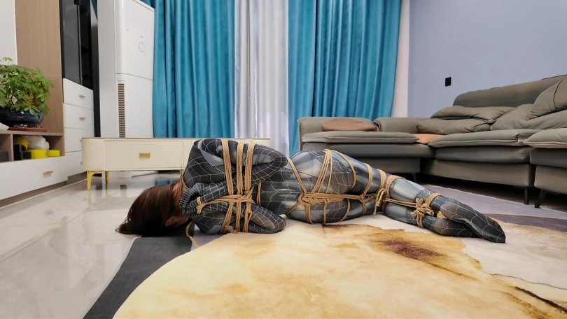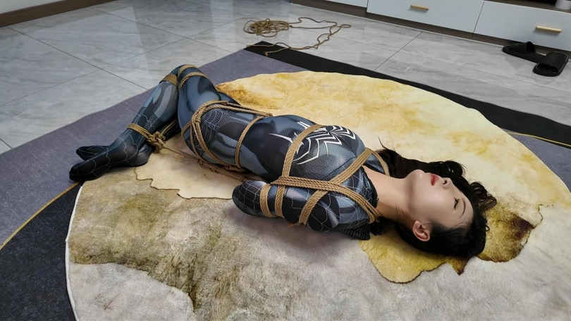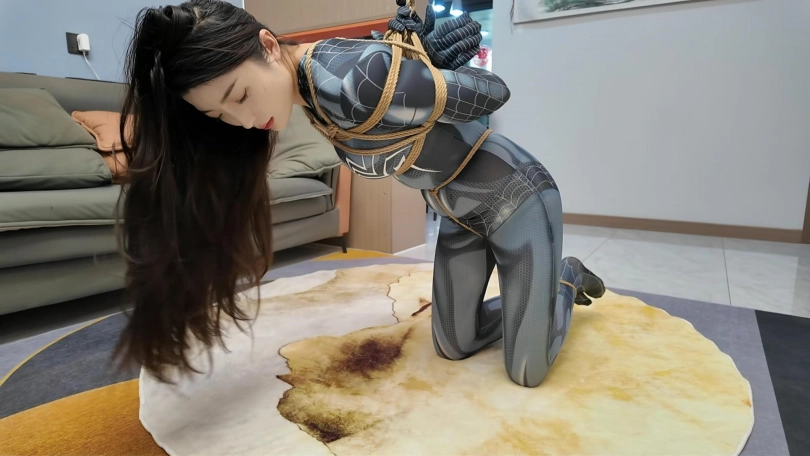 女蜘蛛潜入房间搜查,被抓获捆绑,股绳套在双脚上,一动就会扯动股绳,上半身吊起,这个姿势还是很难受的,并且会紧紧勒着下面,刺激着下面,接下来后手观音驷马更是加大难度,这个女蜘蛛被束缚的可惨了.