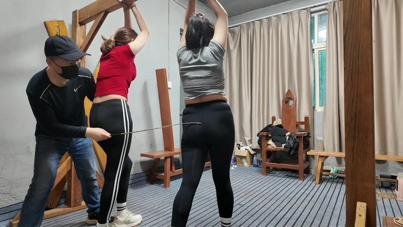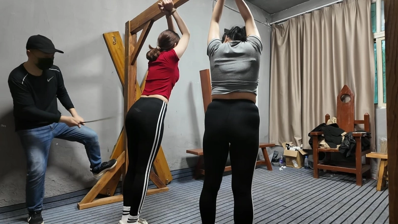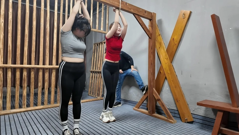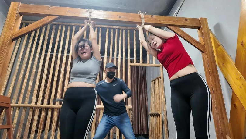 两名女孩踏青,在野外玩SP游戏,玩的正酣,不料被一名神秘男子从后面捂住口鼻,接着又把被绑着的女孩捂晕,把她们带到一个废弃的院子里面,双双绑到老虎凳上面,TK,双双吊起来SP,左右开工,好不快活,最后竟然拿出双棒棒,同时用棒棒刺激两名女孩..