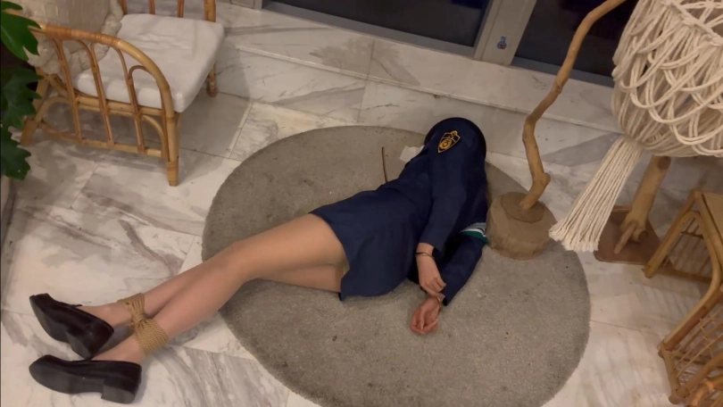 第二幕:美树被绑在地上 帽子丢在旁边 被自己的手铐铐起来异常羞耻 只能跪地站起想办法逃脱