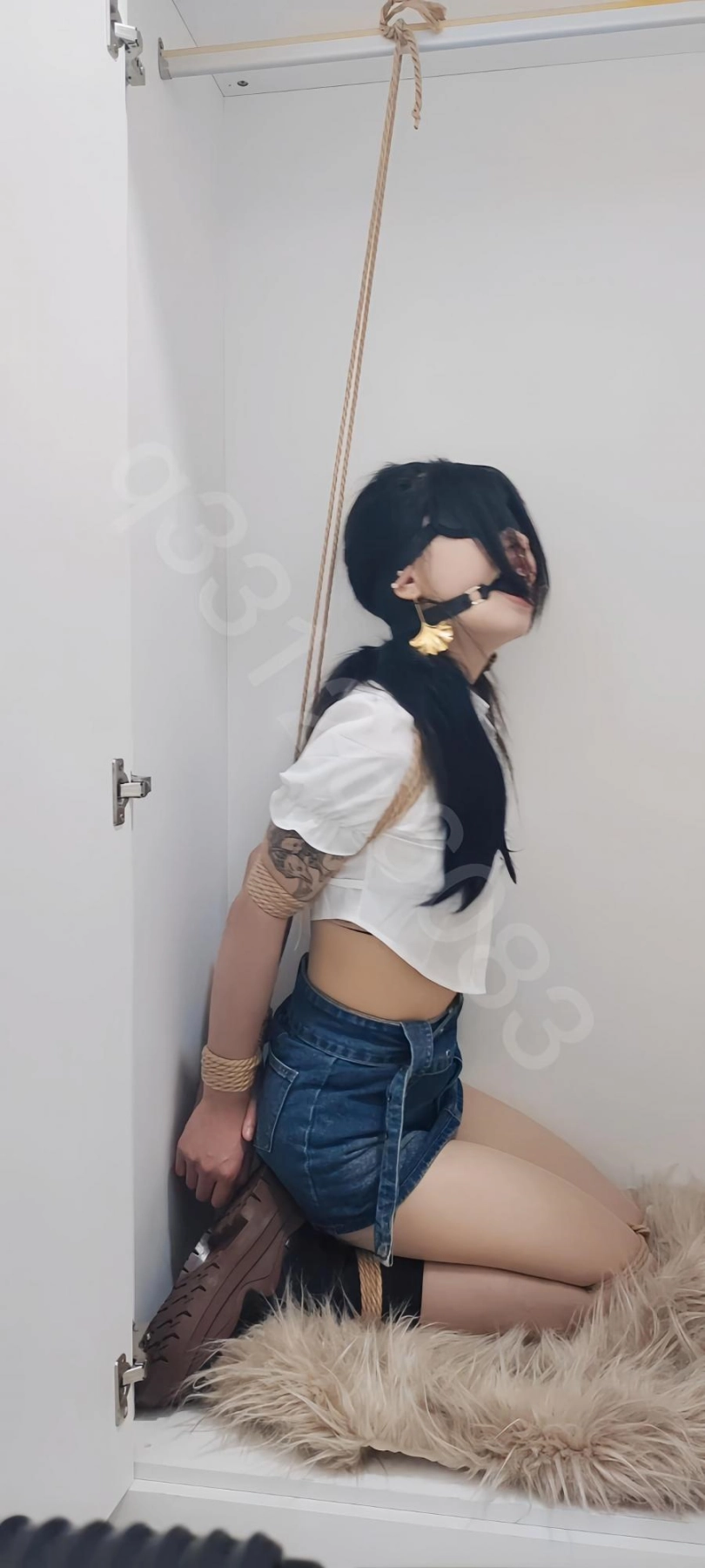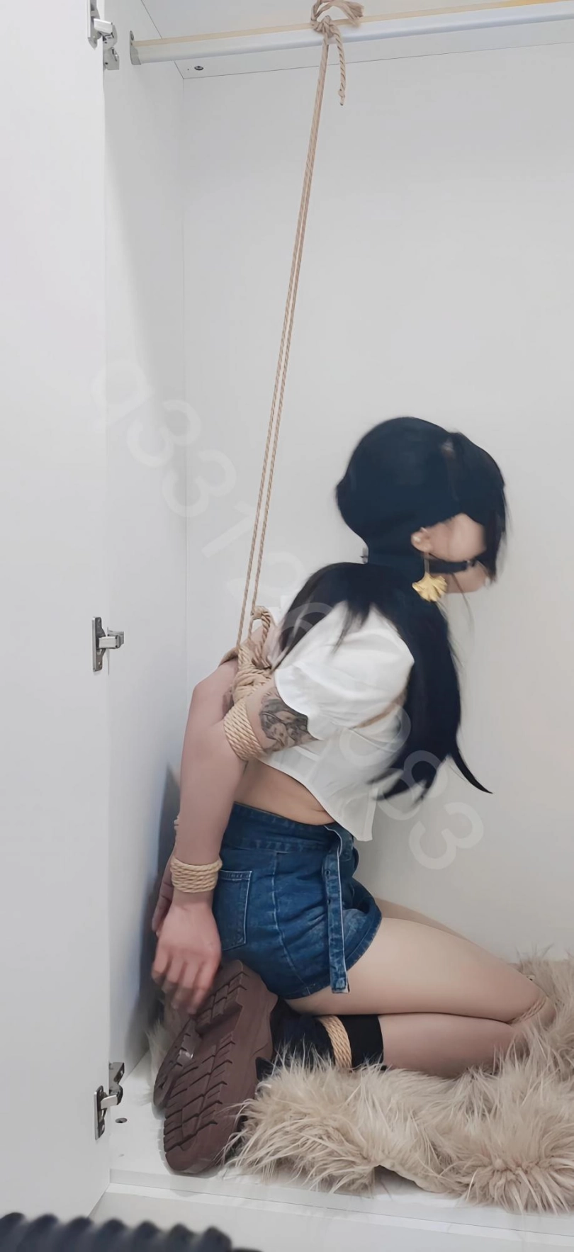 柜子里面解救出来的尤物,不到没有给她解开绳子,反而转变成开始调教,驷马吊缚放置,鞭打,还有其他,最后脸上那一滩白色的确实让人有点兴奋!