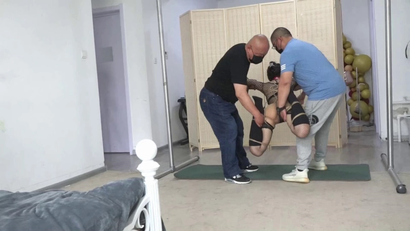 双膝跪地吊缚 鞭打棘轮电击调教 恶趣味开口器配合口球 最后搞的口水直流 把M折腾够呛