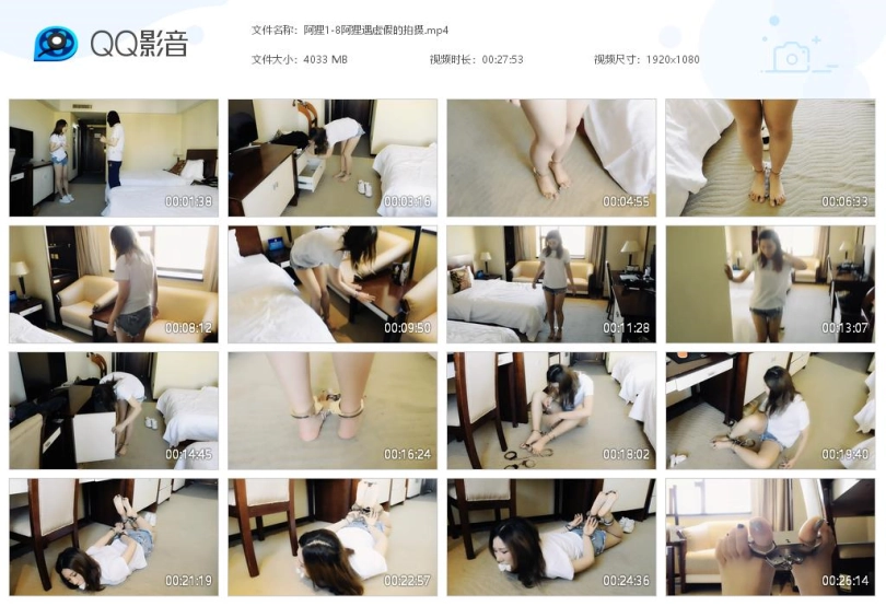 【视频时长】:00:27:53 【文件大小】:4033M 关键词:女神阿狸 虚假的拍摄 手铐 脚铐 脚趾铐 休闲装 自缚 驷马镣铐 袜子堵嘴 小偷在家中行窃时,遇到保姆妹子回来。妹子看到小偷,十分惊讶,而小偷却谎称他们在拍一个微电影。经过小偷一番精心哄骗,妹子觉得挺好玩的,决定参与。拍摄内容内容是寻找镣铐,找到一个就锁在身上,最后摆出一个漂亮的造型。妹子找镣铐,先找到一把脚铐,锁在脚腕上。然后找到一个链子脚趾铐,脱下鞋袜,锁在脚趾上。妹子慢慢行走,找到一个脚趾铐,锁在了脚上。妹子最后找到一个三通、手铐、长脚镣,决定玩个刺激的,在地板上驷马镣铐。袜子堵嘴,鞋放在头边上。趴在地板上,长脚镣拴住一只脚,手铐锁住手,三通锁上脚和连接手。妹子很享受整个过程,很开心。这时,小偷原形毕露,带走了偷来的东西,并且把保姆扔在地上,自己逃跑了。妹子这时才觉得上当了,却怎么挣扎也弄不开,着急了,要哭了。 这个妹子真的是女神!!!高颜值不说,气场也十足!!! ![]() ![]() ![]() ![]() ![]() ![]() ![]() ![]() ![]() ![]() ![]()