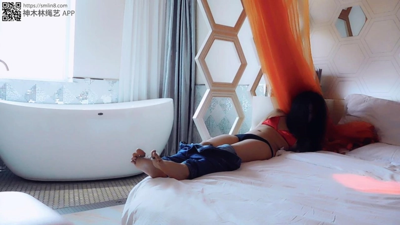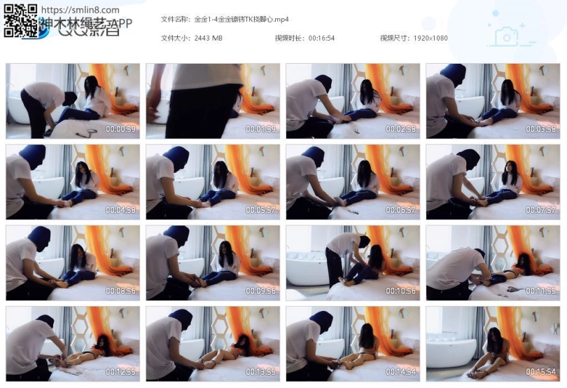 妹子在等朋友回来,然而劫匪缺撬门进入,把她弄到床上上,手背后锁住吊起来,脱下鞋,戴上脚铐,穿着袜子锁脚趾铐,挠脚心,逼问银行卡密码。挠了一会,解开脚趾铐,脱下袜子,再锁上脚趾铐,继续挠,继续逼问。又挠了一会,解开镣铐,脱下衣服,只剩内衣,再锁上两个脚趾铐、三通,继续挠,直到妹子说出了密码,劫匪才离去,留下妹子独自挣扎。