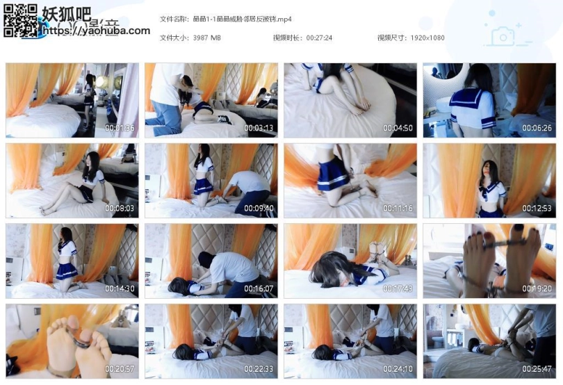 【视频时长】:00:27:23 【文件大小】:3987M 关键词:晶晶 威胁邻居 被铐 手铐 脚铐 脚趾铐 水手服 帆布鞋 口球 跪姿镣铐 驷马镣铐 TK挠脚心 晶晶擅闯邻居私宅,发现了邻居大哥的小秘密,企图威胁邻居却被反杀,脚趾铐被锁在了自己的脚上这叫一个难受哈哈哈!!!邻居大哥拿出所有玩具,可把晶晶折磨坏了哈哈哈!!! 妹子去找邻居家有点事,看到没锁门就偷偷先进去了。在床上发现一个脚趾铐,十分好奇,并且想把这件事透漏出去。这时邻居回来了,妹子想借此敲诈一笔,扬言不给钱就告诉大家邻居玩这种东西。邻居生气了,要让妹子尝尝脚趾铐的滋味,脱下鞋袜,锁上脚趾铐,然后离开。妹子被带上脚趾铐很难受,各种想拔下来,却没办法,下地走路企图活动下,却更疼。邻居回来了,把妹子放到,手背后锁住,戴上脚铐,再加上一个脚趾铐,手脚连起来,跪在床上,戴上口球。妹子挣扎却说不出话,恐惧。 邻居又回来,解开连接,让妹子趴下,驷马镣铐。妹子仍旧说不出话,更恐惧。邻居再次出现,解开口球,放下妹子,要求妹子不许泄露出去,妹子开始不服,于是开始挠脚心。后来换个角度,直到妹子答应为止。 ![]() ![]() ![]() ![]() ![]() ![]() ![]() ![]() ![]() ![]() ![]() ![]() ![]()