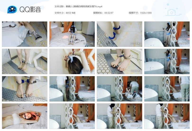 【视频时长】:00:32:07 【文件大小】:4653M 关键词:晶晶 自缚 吊铐 TK 手铐 脚铐 脚趾铐 女仆装 帆布鞋 棉袜 口球 自缚 TK挠脚心 晶晶一个人回家无聊,玩刺激的,自己吊铐起来,钥匙却掉地上了哈哈哈!!!脚趾都被铐了,自然也是抓不住钥匙的,只好等人来解救了!!!结果被男室友发现了,抓到妹子把柄,以后可以好好玩了哈哈哈!!! 妹子一个人回家,看到了床上的镣铐,心想玩点刺激的事情,于是脱下鞋袜。锁住脚趾脚腕,塞入[不可描述],走到架子前,把一只脚拴起来,手上着钥匙,双手分别锁在栏杆上,钥匙拿在手上。妹子自己玩的很爽,扭动身体。妹子想解开手铐,结果钥匙掉在了地上。这下妹子惨了,企图用脚够钥匙,但是双脚被拴住活动范围也很小,而且还脚趾也被锁了,这下妹子可着急了,呼叫救命。男室友回来了,听到喊叫,马上前去,结果看到了此场景。问清之后,室友决定要挟妹子,让妹子以后和他一起玩,妹子无奈下只好答应,室友拿走了剩下的钥匙,并捡起地上的钥匙,放到妹子嘴里,离开。妹子十分惊恐,嘴里的钥匙看得见却拿不到,很着急。最后,坚持不住了,钥匙掉在了地上,妹子大叫并且哭泣。室友回来了,解开妹子,放在床上,把她双手锁在后面,双脚吊起来锁住,脚趾分别锁在一栏杆上,离开。妹子十分惊恐,一直求饶。室友回来了,挠妹子脚心,妹子一直扭动大笑。然后离开。妹子彻底被拴住了,非常难受,哭了。 ![]() ![]() ![]() ![]() ![]() ![]() ![]() ![]() ![]() ![]() ![]()