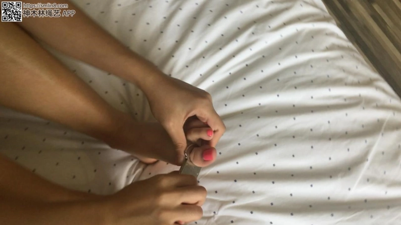 橘子小姐姐发现床边有一个脚趾铐,觉得好奇就自己戴上玩。玩够了想打开时,发现却没有钥匙。床上找了没找到,下地找找也没找到,自己拔也拔不出来,十分着急。亮点是自己给自己所脚趾铐、带着趾铐下地走路和蹦着走,以及企图拔下来脚趾铐。