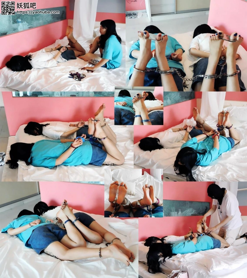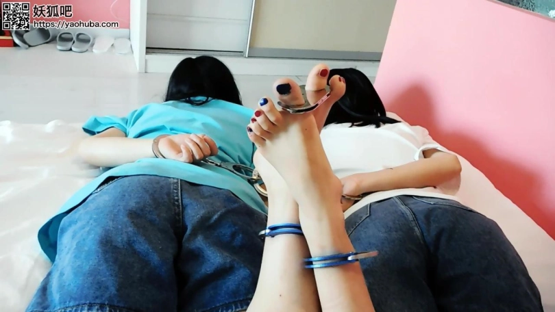 两个妹子回到家,脱下鞋袜,开始玩镣铐,玩点刺激的,一个先把另一个驷马铐起来,然后自己也这样铐起来,并且连在一起。当她们想解开时,钥匙掉在了地上,打不开了。过一阵一个朋友进来有事找,结果看到此情景开心了,挠脚心玩耍,然后把俩人彻底铐在一起,俩人只好难受挣扎。