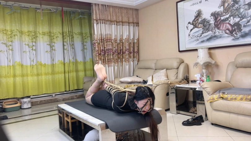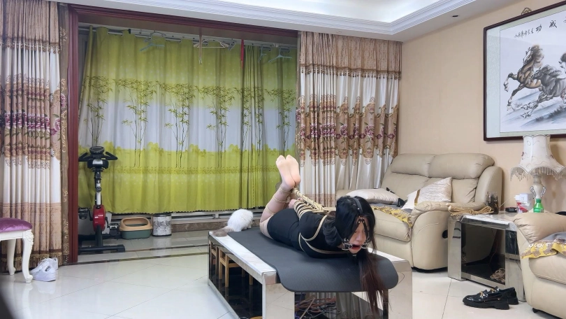 考验球球柔韧性和耐力的直臂驷马放置,再戴上超大的口环强制流口水,事实证明球球柔韧性还可以,直臂可以绑的很紧,耐力就一般般了,直臂驷马坚持了一会就叫受不了了。