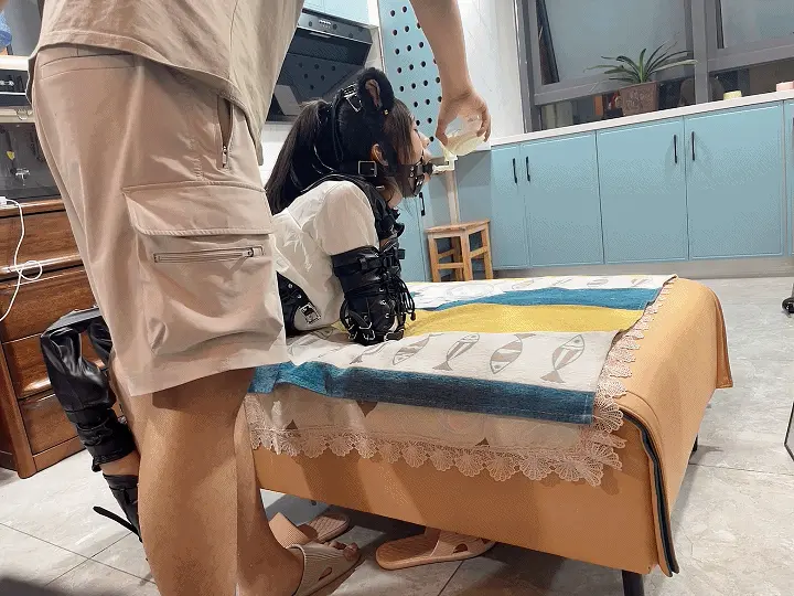 这次在马具口球上加上了强制饮用的配件,倒上无糖酸奶,口水止不住的流,由于头和肛勾固定所以不能低头,然后电击项圈又防止头旋转动,就会一直喝酸奶,口水流不停。