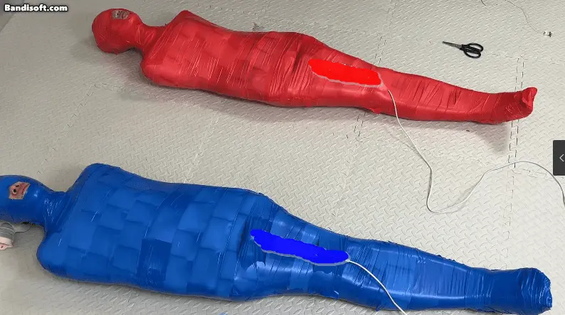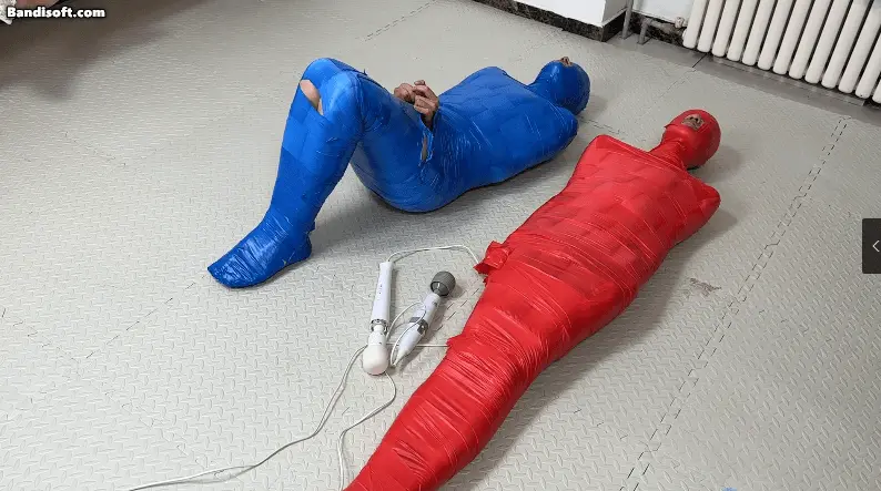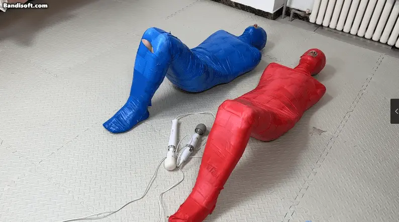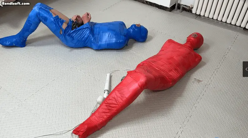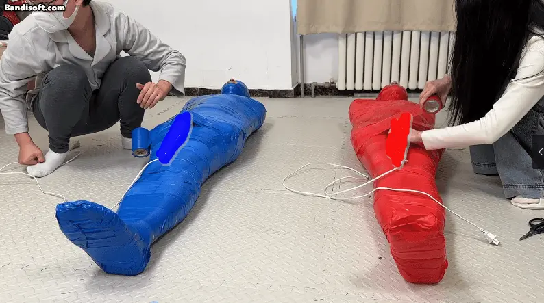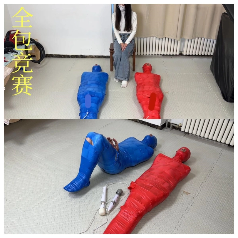 胶带全包的竞赛,裁判颜老师, 两位体验者被红蓝两种颜色的胶带全包束缚住,要经历两场比赛,第一场没人的丁丁上被固定了一个[X_X],谁先缴枪谁就输掉比赛,惩罚是输掉的人要把体验费给另外一个人,第二场是在没有外力的帮助下挣脱胶带木乃伊,惩罚是输掉的人要被全包着过夜。
