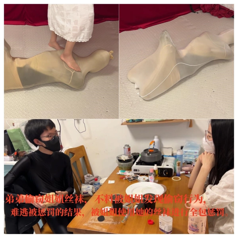 【视频时长】:00:32:49 【文件大小】:575MB 模特:颜老师 弟弟在家里趁着姐姐颜老师不在,将姐姐颜老师穿过的丝袜偷偷拿出来,但是没想到姐姐居然在这个时候回家了!而且还和坐在客厅里面正拿着丝袜的弟弟碰个正着,弟弟来不及藏起来自己偷的丝袜,就被姐姐发现了偷窃丝袜的行为。为了惩罚这个偷自己丝袜的弟弟,姐姐颜老师想到了一个好方法,既然弟弟这么喜欢她穿过的丝袜,那么自己就给弟弟一个和自己丝袜亲密接触的机会!颜老师拿着丝袜开始调教惩罚自己的弟弟。 于是姐姐用自己穿过的丝袜将弟弟包裹起来,实行丝袜全包惩罚,弟弟全身上下都被姐姐的丝袜紧紧包裹,一条裹住双腿折叠起来,一条丝袜做成单手套将弟弟双手拘束在身后,再用裤袜将身体完全包裹起来,这次能好好和他喜欢的丝袜亲密接触了。颜老师将被丝袜全包的弟弟直接放在地上,任凭自己弟弟在丝袜茧里面挣扎,但是光滑的丝袜束缚了弟弟的身体,无论怎么挣扎都没有着力点,也不可能从姐姐精心包裹的丝袜茧里出来。 颜老师看着弟弟在地上的丝袜茧里面挣扎,又拿来了一双白色丝袜,将原本就紧绷的丝袜茧再裹上一层,这样弟弟就根本无法从丝袜茧里面挣脱出来了,光滑的丝袜摩擦弟弟的身体,反抗都是徒劳无用的。全身上下都被丝袜紧紧包裹,弟弟不断尝试挣扎,但是这样也只是不停消耗自己的剩余体力,一边的姐姐颜老师在思考接下来要怎么继续调教这个偷窃自己丝袜的弟弟。 (本期看点:丝袜,丝袜全包,多层,单手套,拘束) ![]() ![]() ![]() ![]() ![]() ![]() ![]() ![]() ![]() ![]()