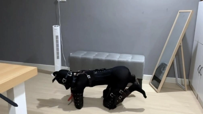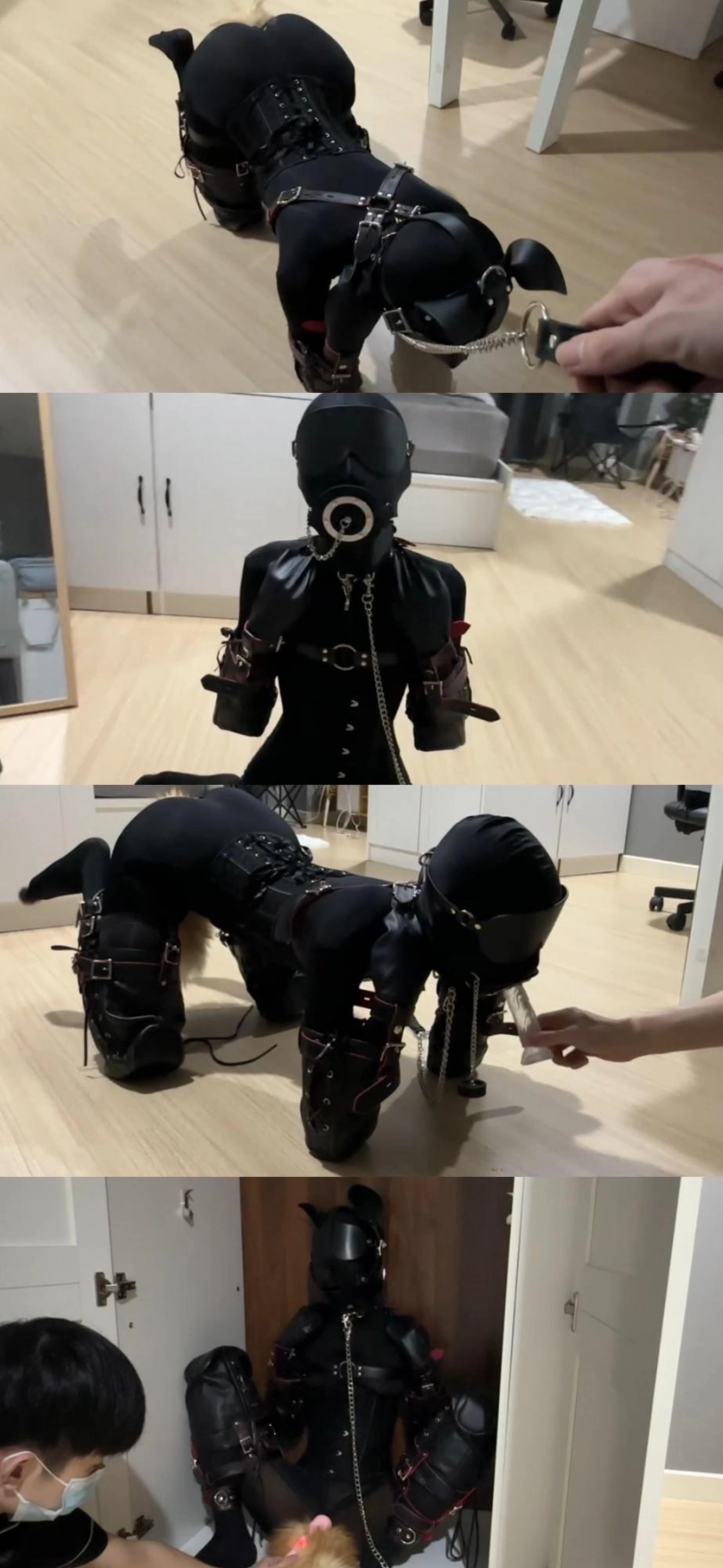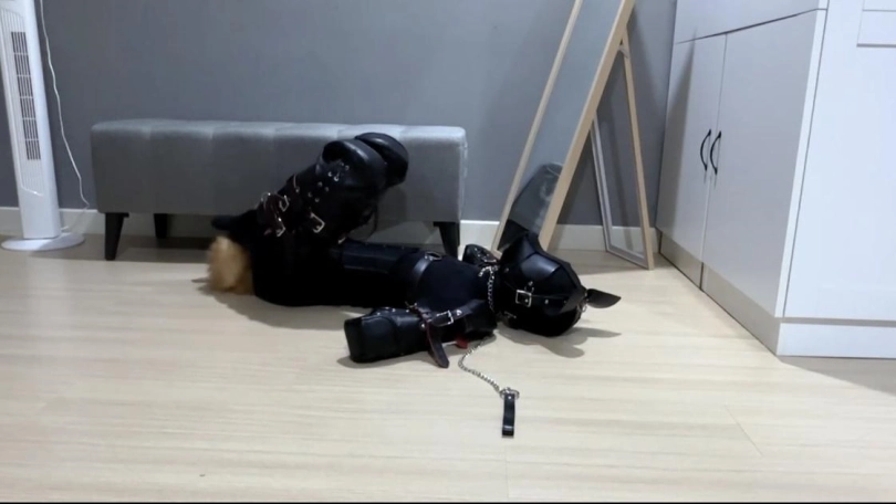 比上次更完整的K9深入训练 一开始小鱼穿好连体衣带上了狗狗面具 K9套装 塞上小狗尾巴 怕太久没变小狗生疏了 先练习爬行一会