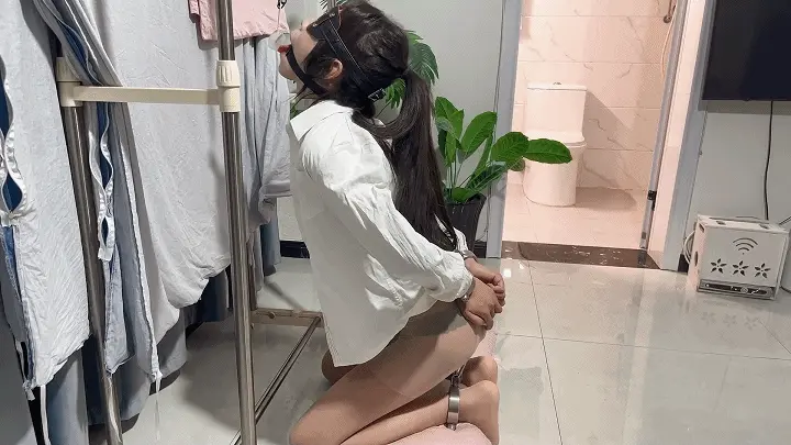 晴子这次被坏人用镣铐锁住,金属项圈手铐和脚铐还有肛勾相连,并且锁链只够稍微抬起身子。