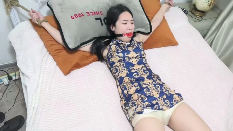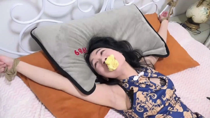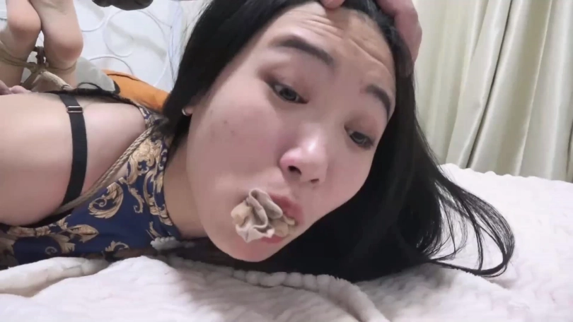 剧情:童瑶在家被歹人(胡子哥)劫持大字绑在床上,歹人恶趣味把童瑶穿过没洗的一条脏内裤塞到童瑶嘴里,然后在童瑶家里翻找财物。