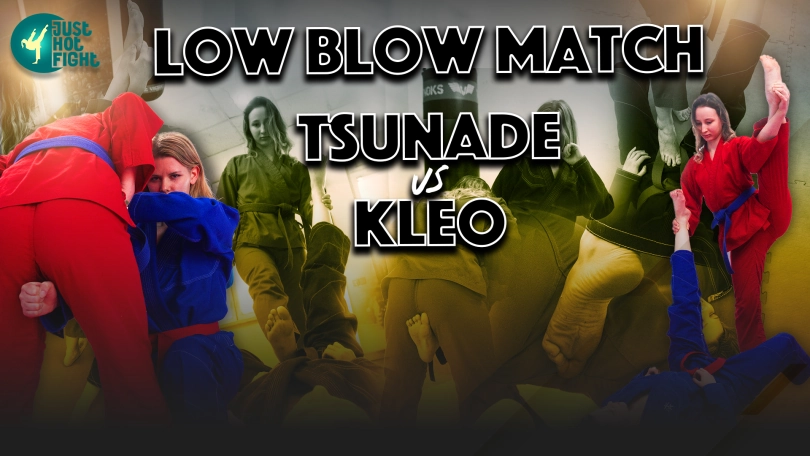 Two girls in different kimonos do a warm-up then proceed to fight and hit with kicks to the groin. They use hand and foot strikes between the legs.