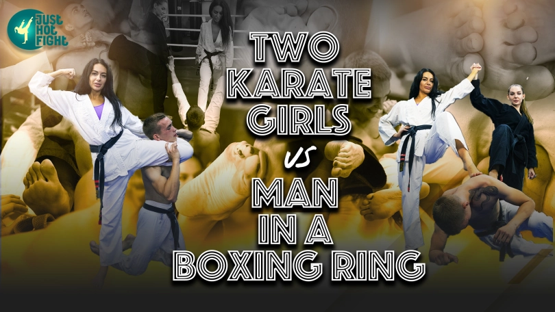 Two karate girls were practicing in a boxing ring with a man punching a bag. He decided he was in charge and attacked the girls. He soon regretted it, receiving many blows to the face, groin and stomach.