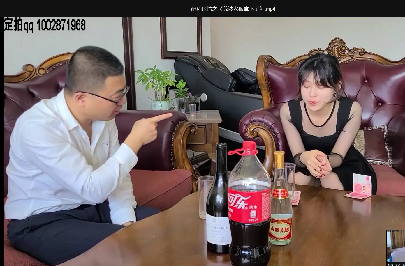 女孩来应聘,老板诱骗女孩喝酒打赌赚钱,女孩一连气喝了很多酒,然后老板让她走直线测试是否醉了,接下来继续给女孩灌酒,最后女孩胡言乱语人事不省,老板就把女孩抱进卧室捆绑双脚供自己淫乐.....