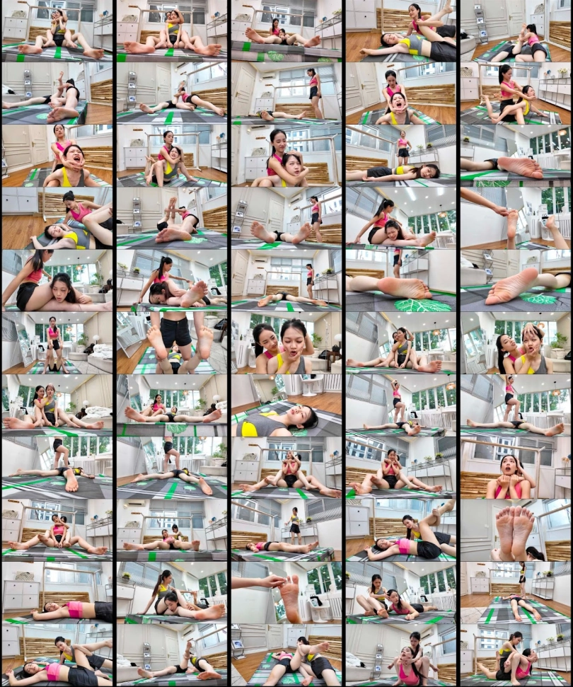 2 new rookies are Haruko (Yellow Top) and Kazusa face each other in a wrestling match with various moves like head-scissor, sleeper hold, Camel Clutch