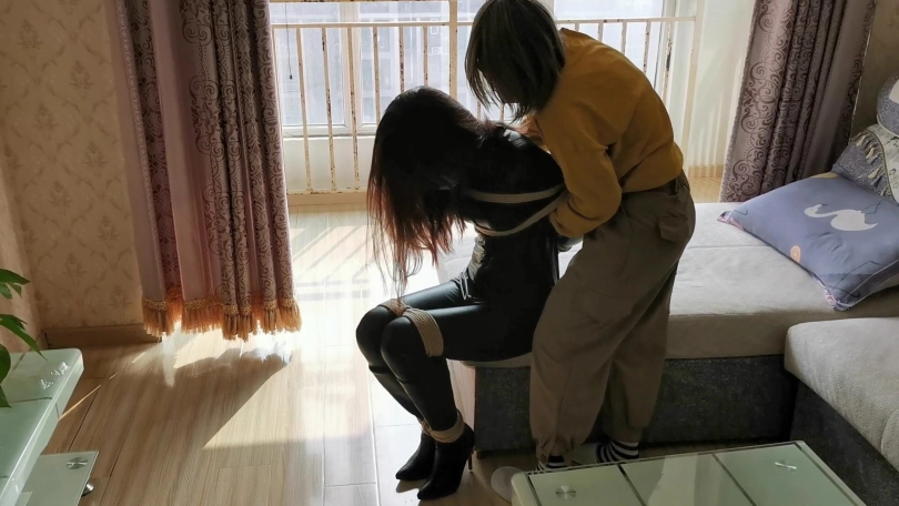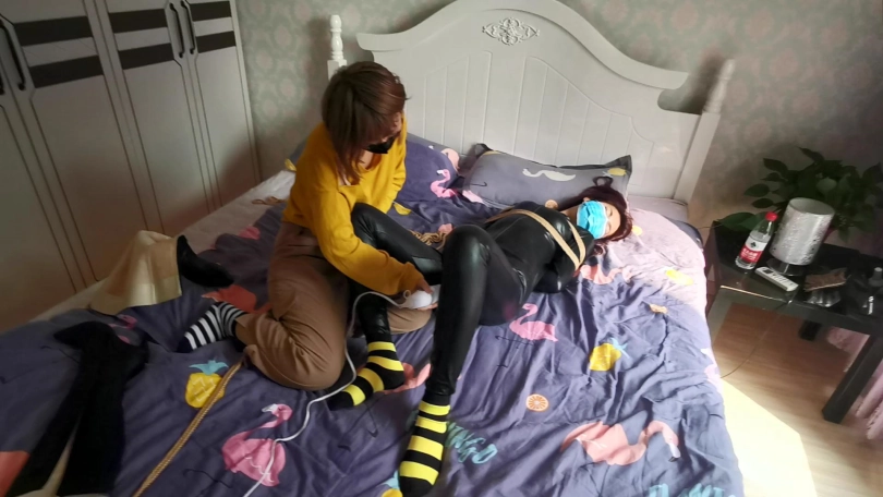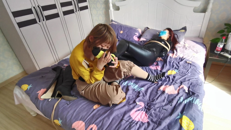 女孩挣脱束缚后,从衣柜中拿出迷药,门缝中看到女匪在客厅的沙发上睡觉。偷偷的走到对方身边,轻轻的把迷药捂在女匪的口鼻上。拿出绳子将女贼捆绑起来。醒来后的女贼发现自己手脚全身被紧紧的捆绑起来,很是恼火,拼命的挣扎,但身上的绳子丝毫没有松动。女孩走过来将她扶进卧室的床上,用女贼对付自己的方式对付女贼,不断的用脚挑逗着她,在女贼身上敏感地方游走,并侮辱性的把脚放在她的脸上,强迫女贼闻脚。解开脚上的束缚,脱去她的皮靴,女孩贪婪的亲吻着女贼的棉袜脚,这感觉貌似很舒服,竟让女贼轻微的呻吟起来,女孩见状拿出[不可描述]棒,对着女贼下面开始刺激。这突然袭来的[不可描述]让女贼无法承受,臀部不断的扭动抽搐,呼吸也变得急促,吼叫声也慢慢的变成了娇喘呻吟声。此时的女贼已经放弃了抵抗,在这强烈的刺激下,下面终于井喷释放。女孩停下手中的[不可描述]棒,开着床上已经虚脱的女贼说:“其实我一直喜欢捆绑囚禁的,一直找不到玩伴,正好你自己送上门来,以后你就当我的玩伴吧。”说完女孩便搂着女贼开始亲吻,女贼惊恐痛苦的摇着头。。。