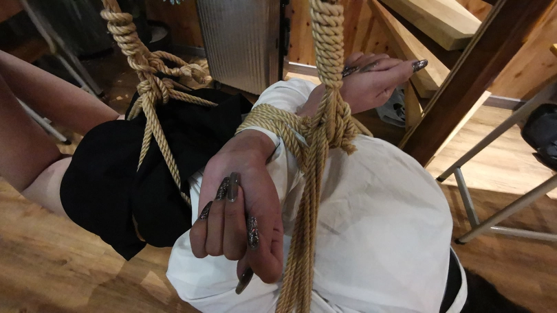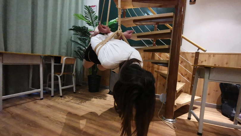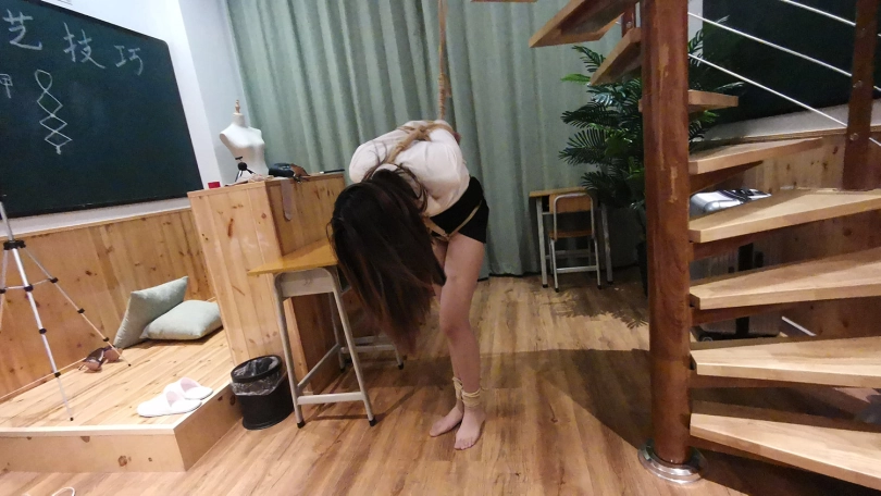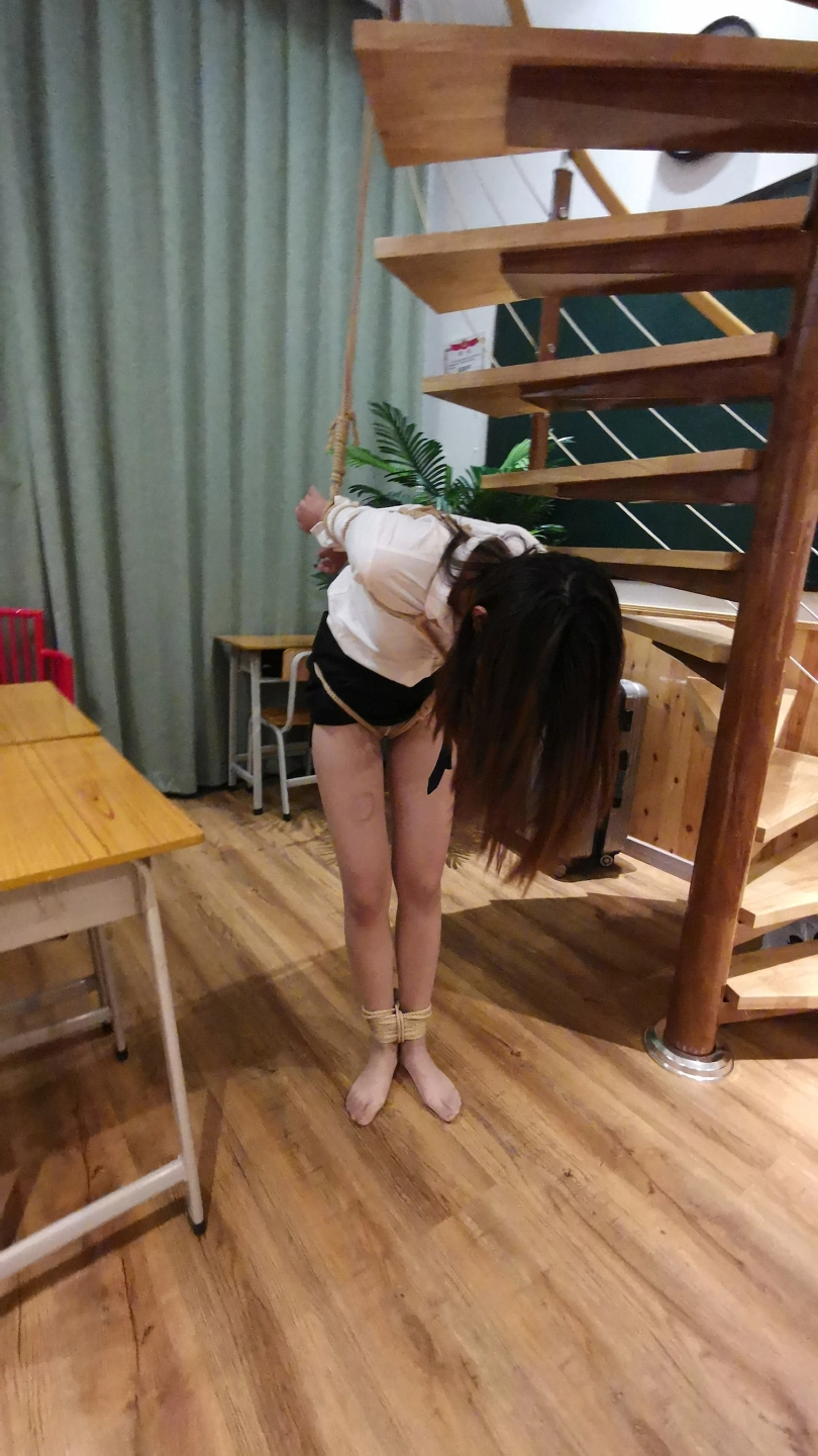 老师半站半趴在桌子上,脖子身体被固定在课桌上,嘴里塞着口球,口水直流;接着又被驷马姿势吊缚;然后后高手束缚,脖子与大腿之间用绳子连接起来,使其抬不起身,弯不下腰。老师绝望的挣扎呻吟。。。(这几个姿势都是比较痛苦难受的,视频里瑾萱的挣扎呻吟喘息也是真实反应)