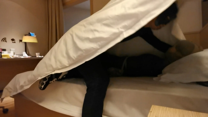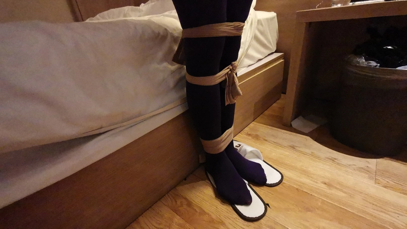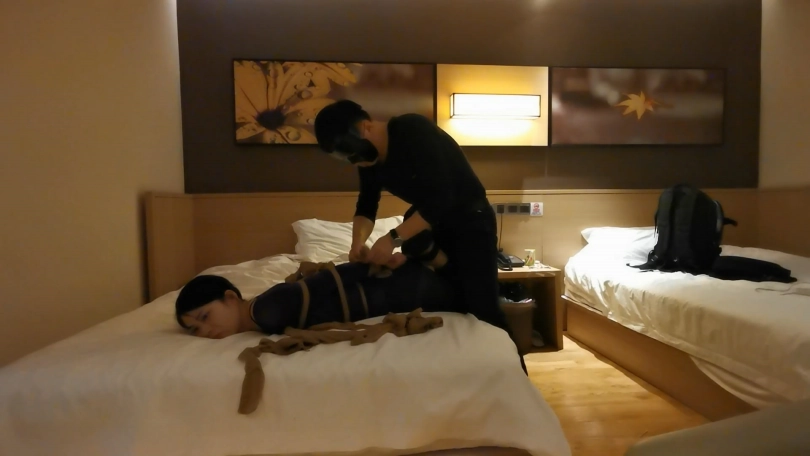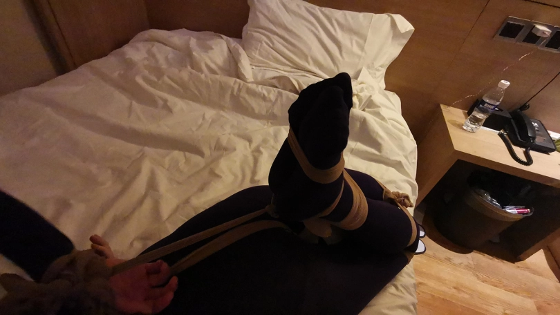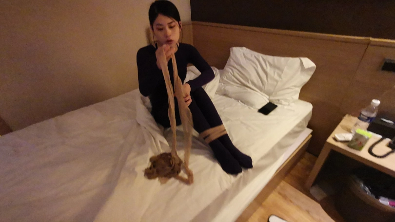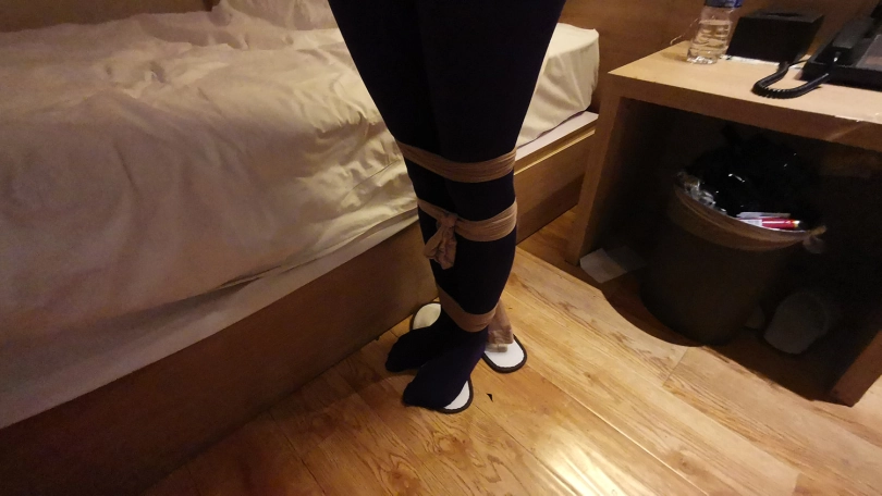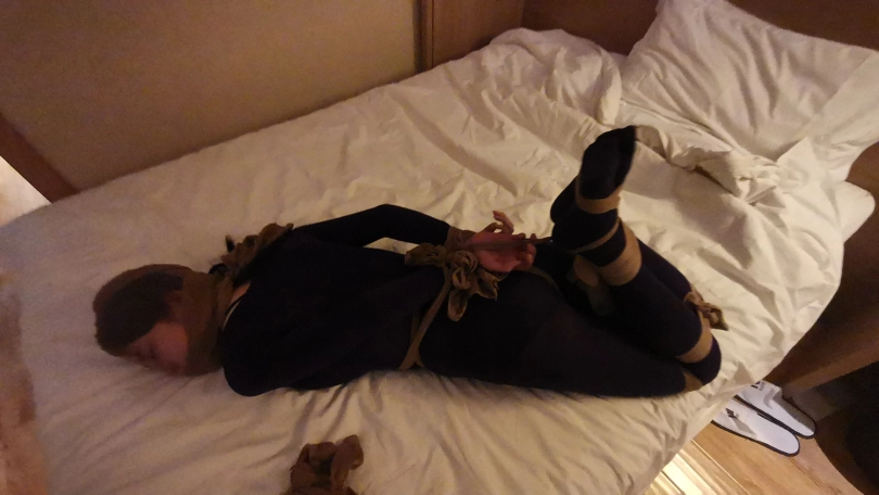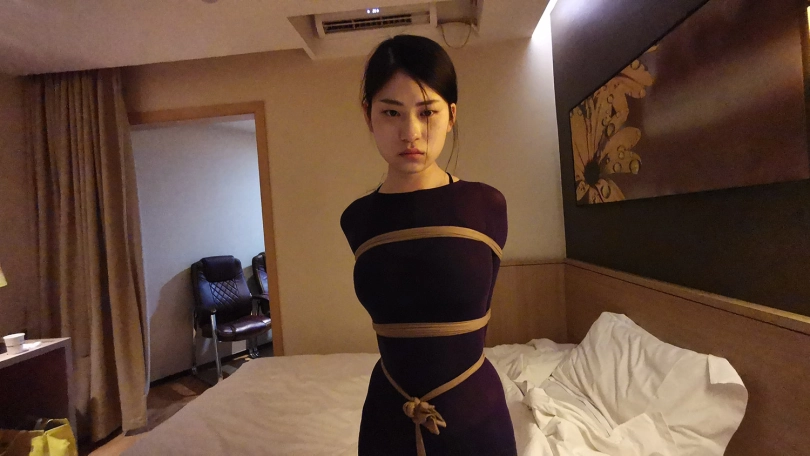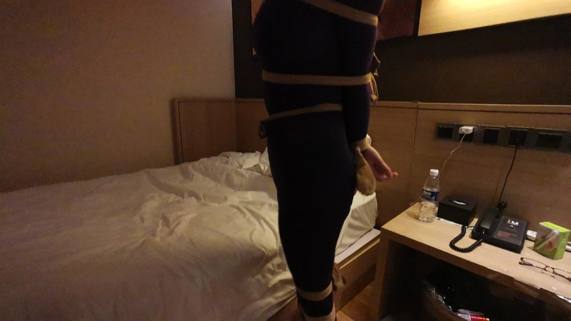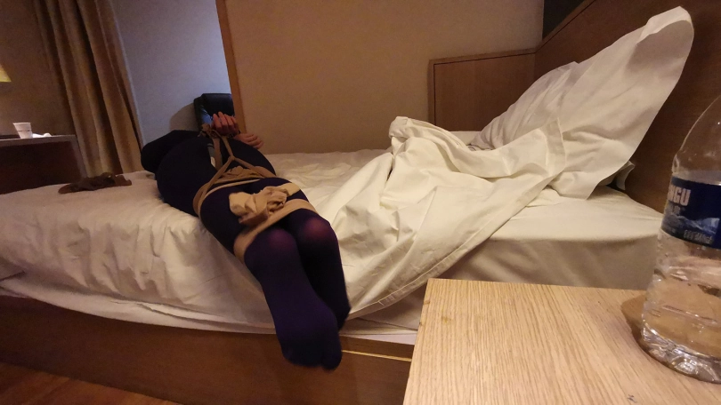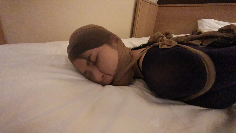 小冷打牌输了,对方说只要你被我玩下捆绑游戏,欠的赌债就一笔勾销,小冷答应了。在对方的要求下,小冷脱的只剩内衣,并穿上了一身紫色连体裤袜衣。并用裤袜自己绑住自己的腿脚。然后对方用裤袜将她绑成驷马,并用裤袜套头勒嘴。这时对方凶相毕露说:“玩捆绑只是一个幌子,其实是想让你陪我一晚,知道你不会同意,那就只好这么绑着了。”小冷听后大为惊恐,不断的扭动身体,但绑的很紧挣脱不开。随后对方关了灯,盖上了被子,从被子里传来小冷被堵住嘴的”呜呜”和“嗯嗯”声。。。
