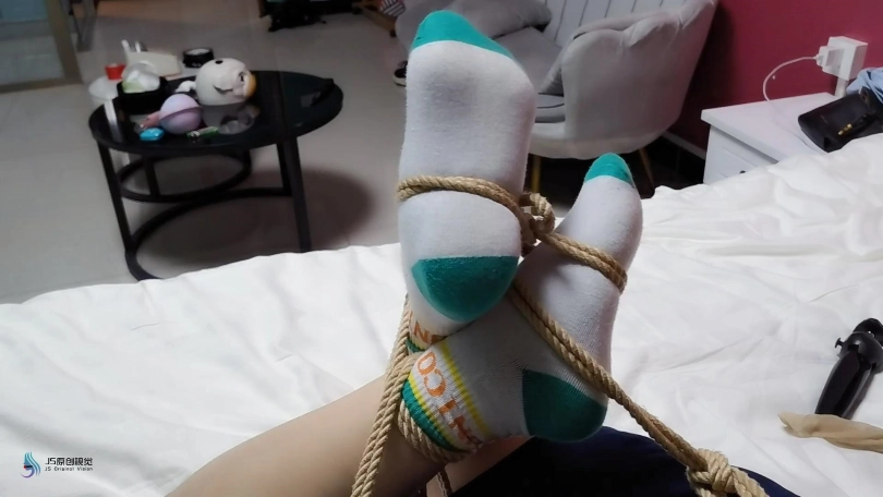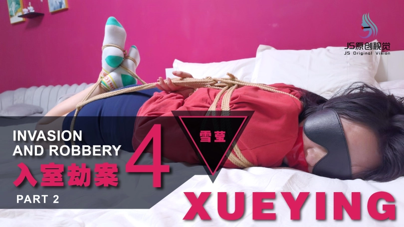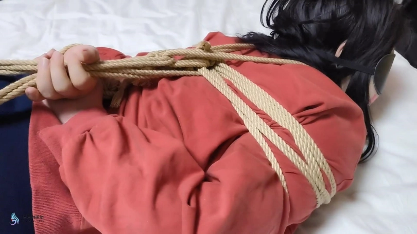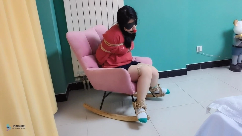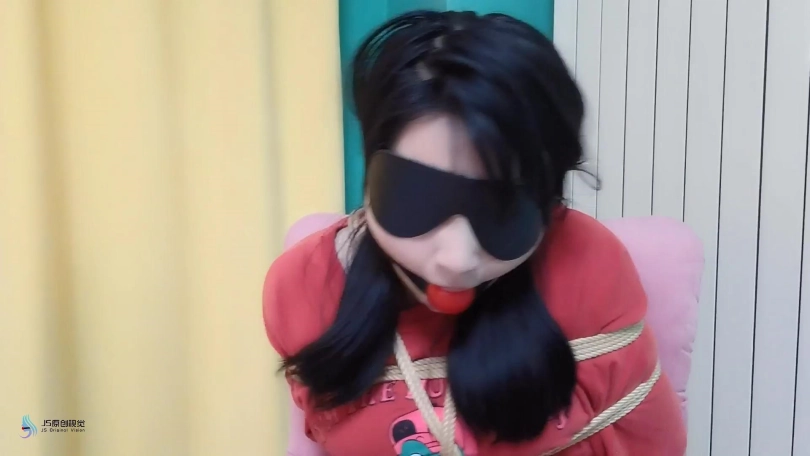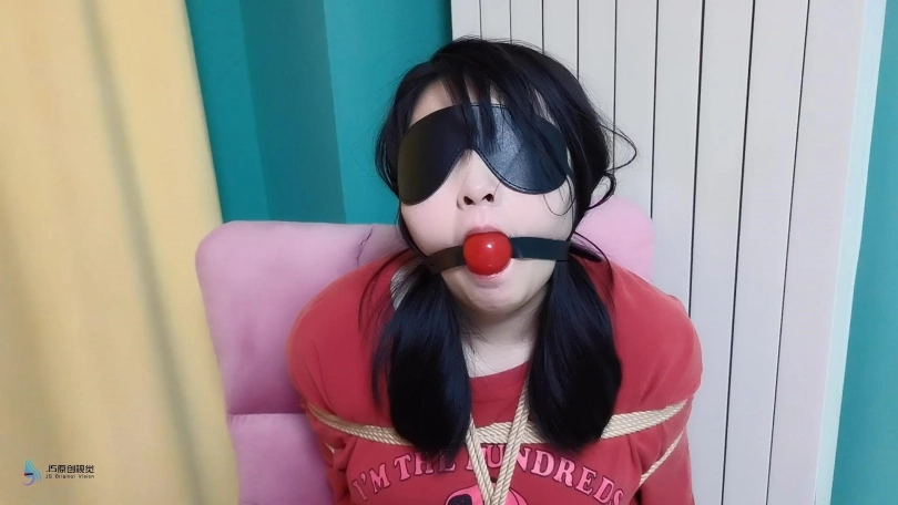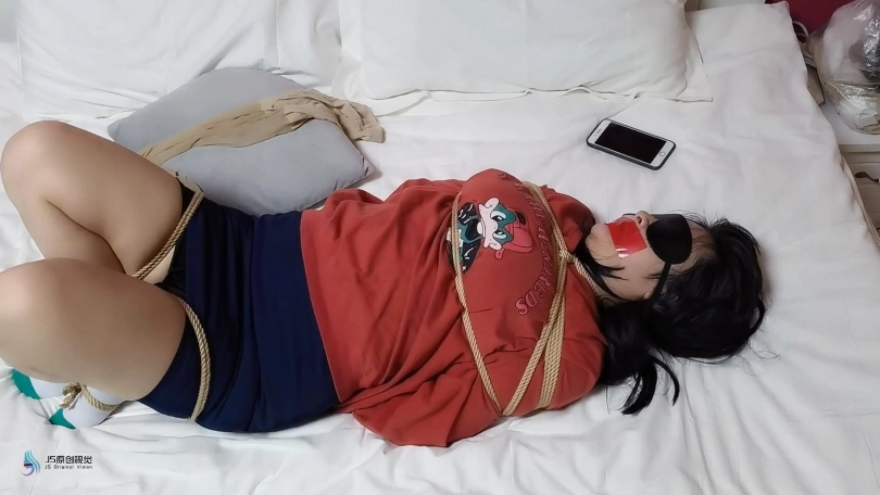 歹徒将妹子捆绑在椅子上,四肢固定好。嘴里用口球堵嘴,蒙眼;在将她驷马绑在床上,胶带封嘴。