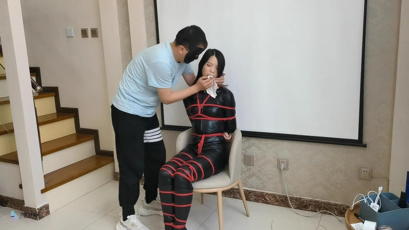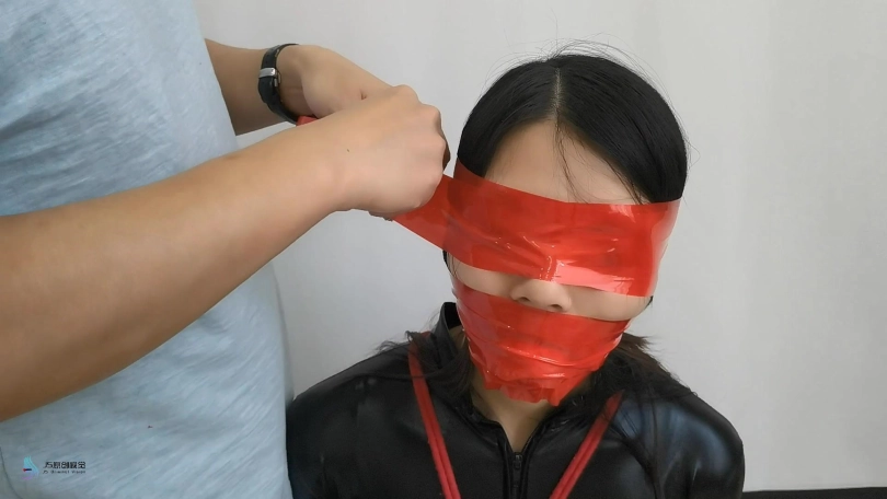 人贩用红色的绳子将诗彤捆绑起来,再绑上股绳,她的双腿从脚部开始,被绳子一圈一圈的紧紧束缚起来。人贩将让她坐在椅子上。用一团不塞进她的嘴里。并用红色胶带缠绕她的嘴巴和眼睛。诗彤看不到也叫不出声,每次挣扎,胯部的股绳都刺激着她敏感的地方。这使她很难受,不敢有太大的动作。只能在椅子上“呜呜”的挣扎着。