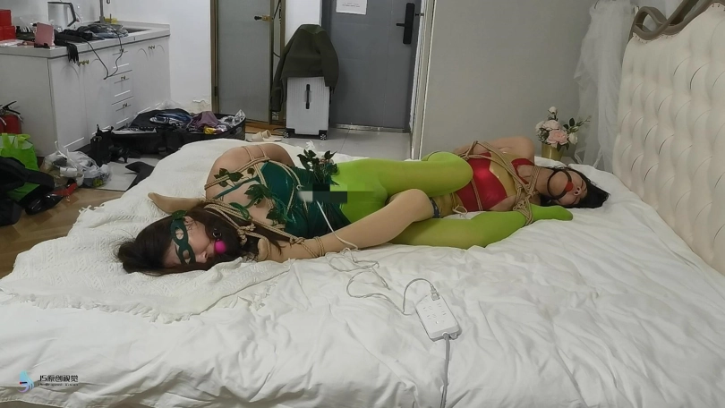 神奇女侠和毒腾女被面对面的绑在椅子上,彼此的脚绑在对方的腿上。批次的脖子被绑在一起,嘴里都被塞着口球。在下一个场景,她们彼此头对脚的在场上绑在一起,被迫的闻着对方的丝足。神奇女侠下面被TD刺激着,毒腾女下面被棒棒刺激着。两位超级英雄痛苦的呻吟着。