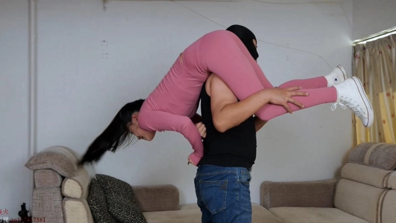 身穿全红瑜伽套装的希希回家途中被袭击,随后被拖回屋内不停扛起抗下。