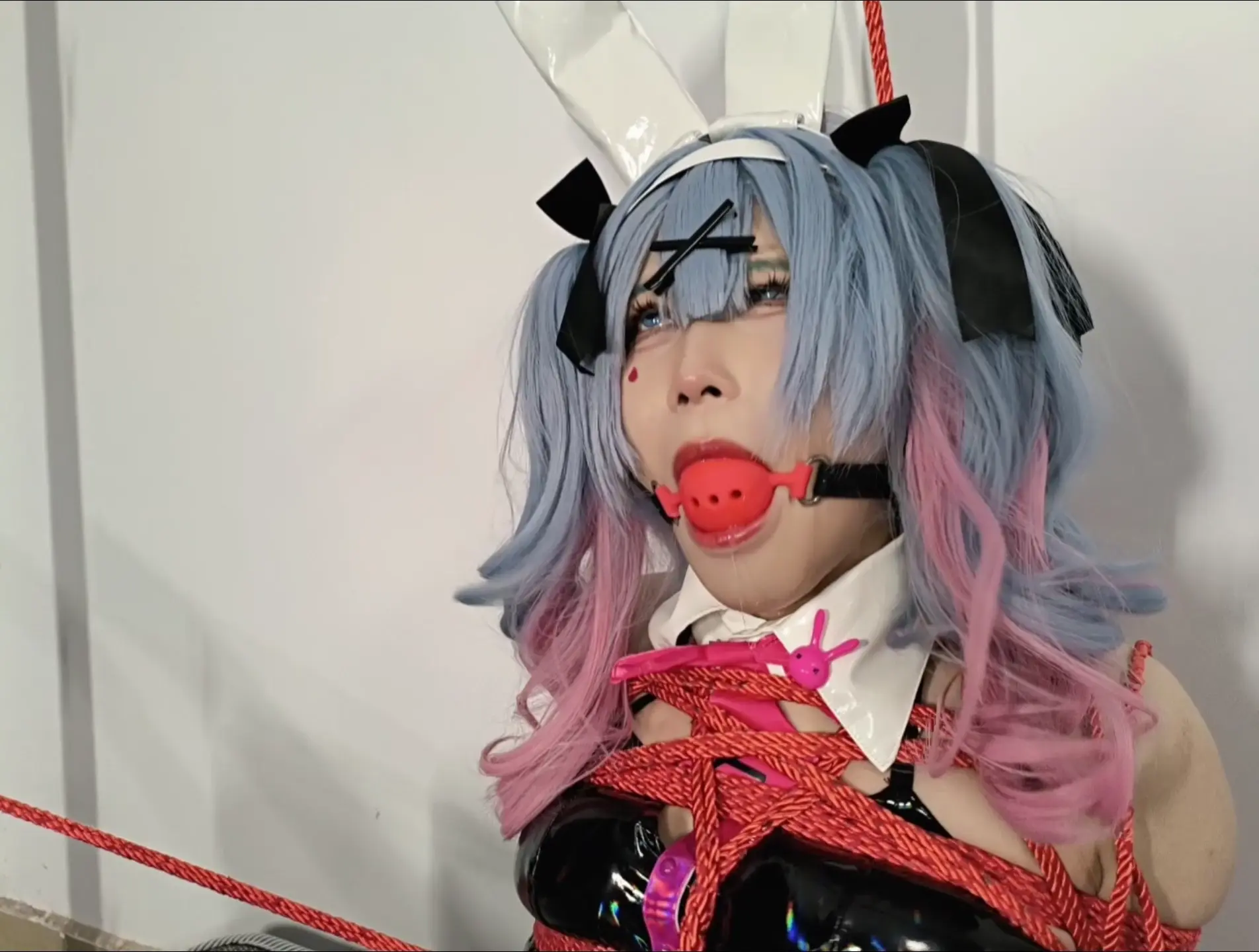 被绑架的兔女郎miku,全身缠满了绳子,绑成了强制开腿缚。中门大开的双腿那羞耻的姿势,miku用尽力气也无法并和上双腿。还没胸手录制着视频,羞耻的miku不断的躲闪镜头也毫无作用。